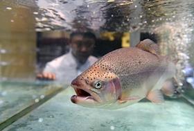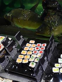 Торговый зал супермаркета премиум-класса "Глобус-Гурмэ". Живая рыба в аквариуме.