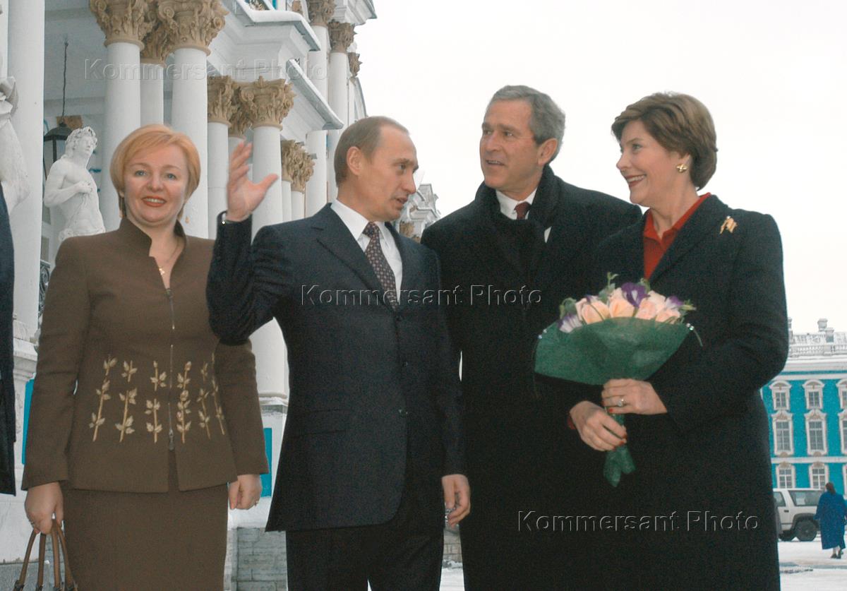 US and Russian presidents Vladimir Putin (left) and George W. Bush (right), flanked by their wives Lyudmila (left) and Laura (right), pose for a photo outside the Catherine Palace in the St.-Petersburg suburban town of Tsarskoye Selo.