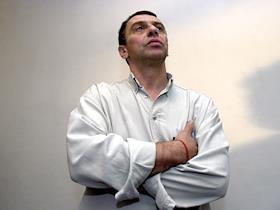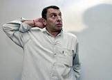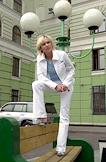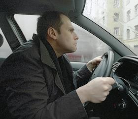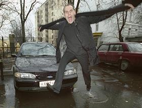 TV comedian Mikhail Shats poses for a photo at the wheel of his car.