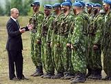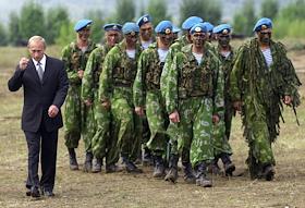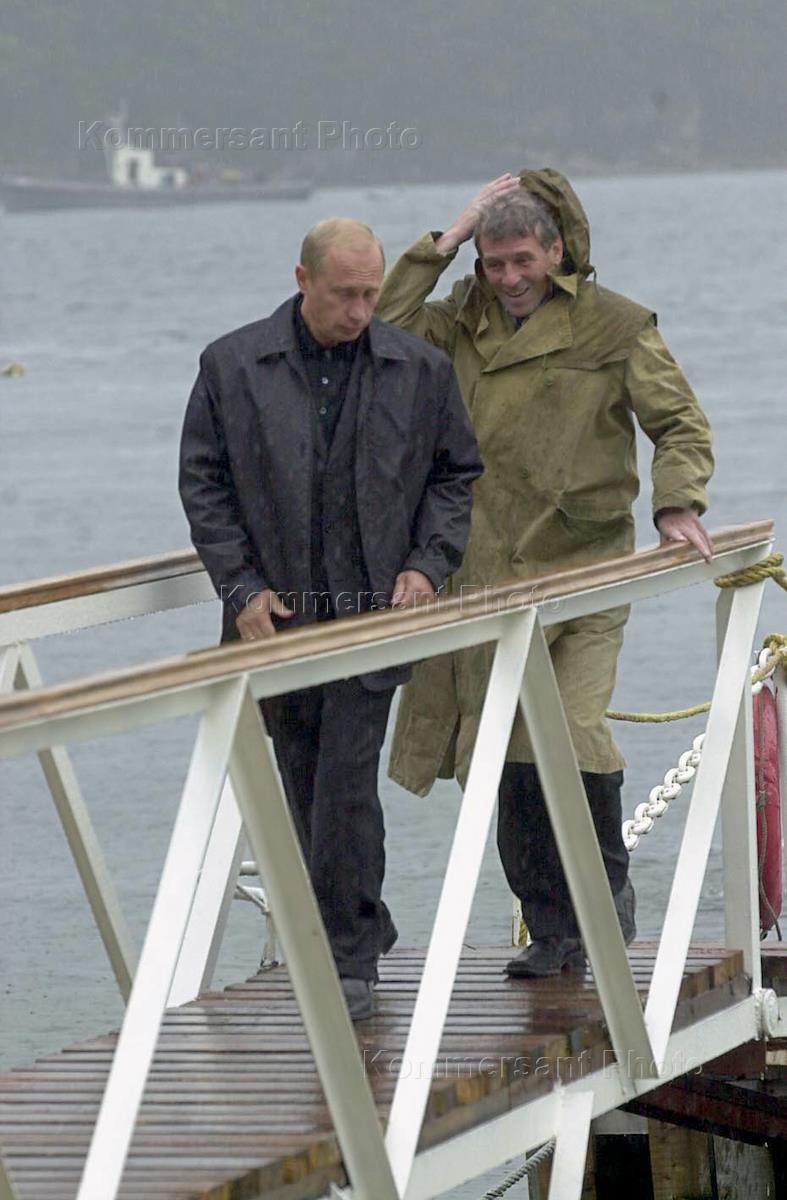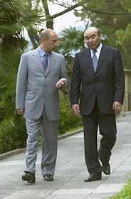 Russian President Vladimir Putin (left) talks to his counterpart of Kyrgyzstan Askar Akayev (right).