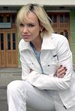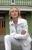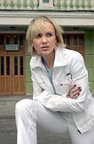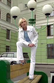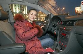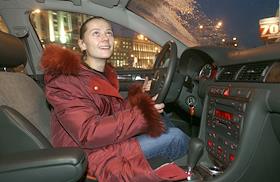 Russian actress Maria Golubkina poses for a photo at the wheel of her car.