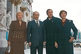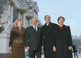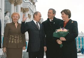 Russian President Vladimir Putin (centre left) and his wife Ludmila (left) meet the former's American counterpart George W. Bush (centre right) and the US first lady Laura Bush (right) in Tsarskoye Selo outside St.Petersburg.