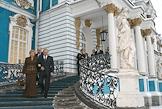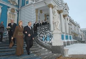 Russian President Vladimir Putin and his wife Ludmilla descend the Catherine Palace stairs during US President George W. Bush's visit to St.Petersburg.
