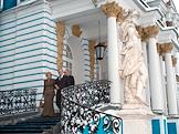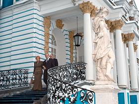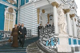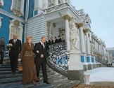 Russian President Vladimir Putin (right) and his wife Lyudmila descend the Catherine Palace front stairs to meet US President George W. Bush and his wife in Tsarskoye Selo outside St.-Petersburg.