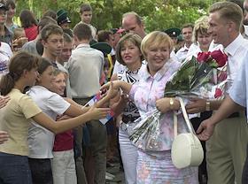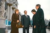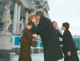 Russian President Vladimir Putin and his wife Ludmila meet US President George W. Bush at the entrance into the Catherine Palace, in Tsarskoye Selo outside St.Petersburg, on the American leader's visit to Russia.