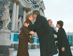 Russian President Vladimir Putin and his wife Ludmila meet US President George W. Bush and and his wife at the entrance into the Catherine Palace, in Tsarskoye Selo outside St.Petersburg, on the American leader's visit to Russia.