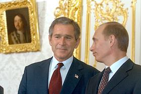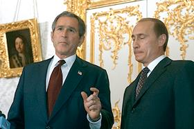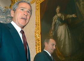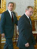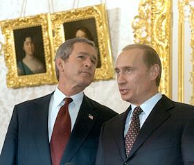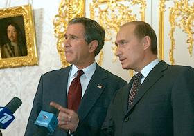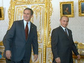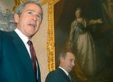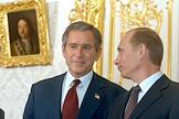 US President George W. Bush (left) and his his Russian counterpart Vladimir Putin are interviewed in the Catherine Palace in Tsarskoye Selo outside St.Petersburg.