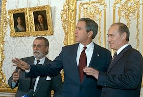 US President George W. Bush (centre) is shown around Catherine Palace in Tsarskoye Selo outside St.Petersburg by his Russian counterpart Vladimir Putin (right).