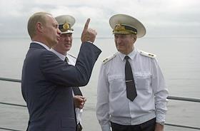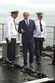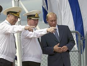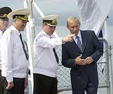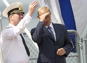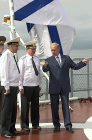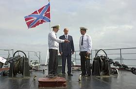 Russian president Vladimir Putin (right) visits a Russian Navy ship.
