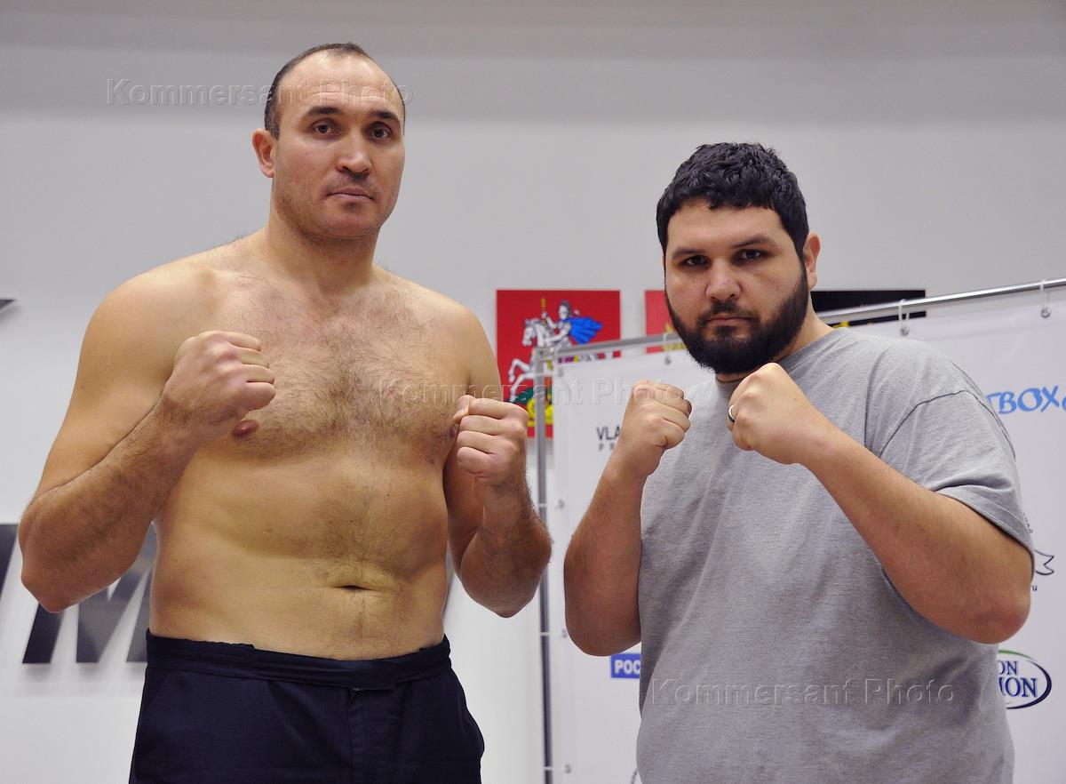 Процедура взвешивания боксеров перед международным боксерским шоу THE REAL BOXING прошла в холле стадиона "Арена Химки". Белорусский боксер Александр Устинов (слева) и новозеландский боксер Чонси Велливер (справа) во время процедуры взвешивания.
