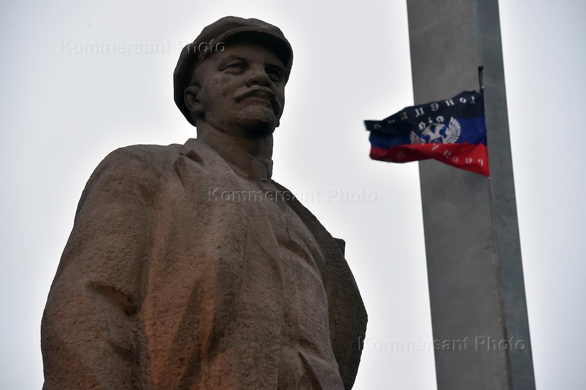 Виды Донецка. Памятник Владимиру Ленину и флаг Донецкой Народной Республики (ДНР).