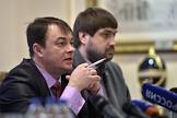 Политическая ситуация в Донецкой области. Руководитель Администрации главы ДНР Максим Лещенко (слева) перед началом пресс-конференции главы ДНР Александра Захарченко.