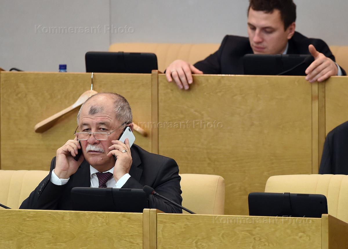Член комитета Государственной думы (ГД) России по природным ресурсам, природопользованию и экологии Юрий Эм (слева) на пленарном заседании Госдумы России.