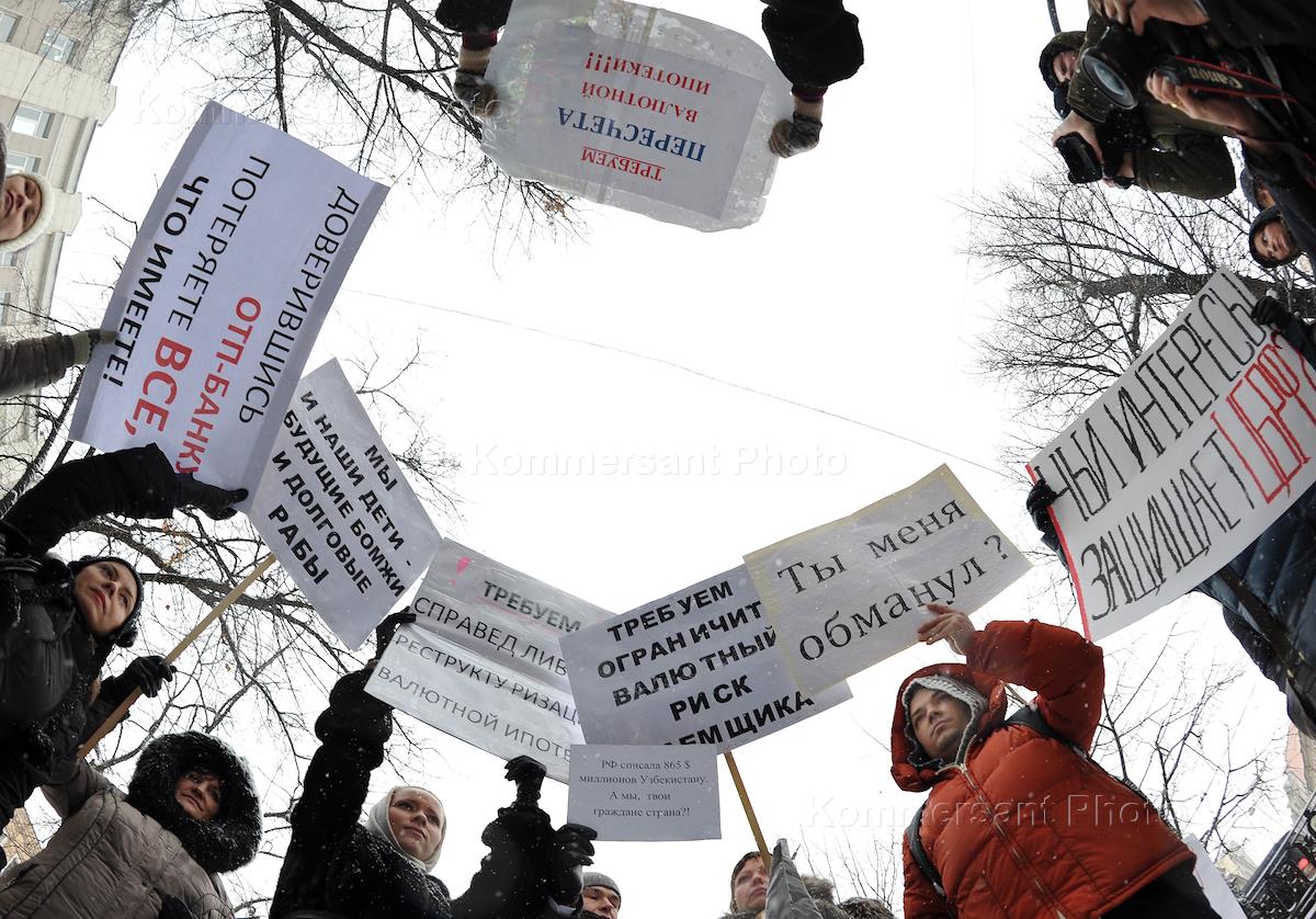 Пикет, организованный представителями группы валютных ипотечников, прошел у здания Центрального банка России.