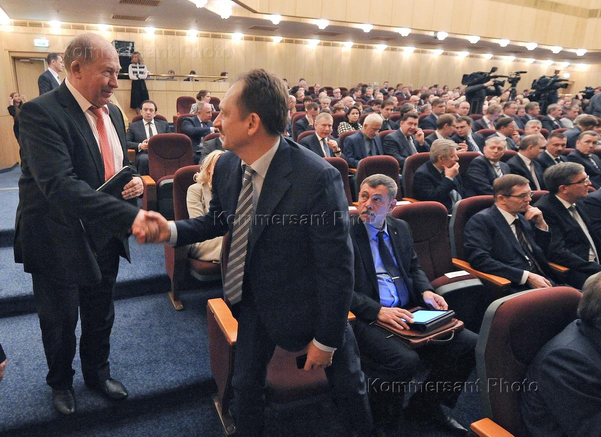 Заместитель министра внутренних дел (МВД) России по безопасности на транспорте, генерал-полковник полиции Виктор Кирьянов (слева) и заместитель председателя Счетной палаты России Валерий Горегляд (в центре) во время совещания под руководством руководителя администрации президента России Сергея Иванова. Совещение прошло в "Президент отеле".