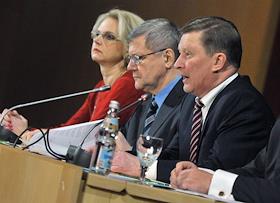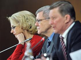 Cлева направо: председатель Счетной палаты России Татьяна Голикова, генеральный прокурор России Юрий Чайка, руководитель администрации президента России Сергей Иванов на совещании по вопросам совершенствования госконтроля в "Президент отеле".