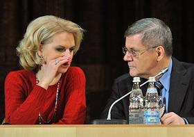 Председатель Счетной палаты России Татьяна Голикова (слева) и генеральный прокурор России Юрий Чайка (справа) на совещании по вопросам совершенствования госконтроля в "Президент отеле".