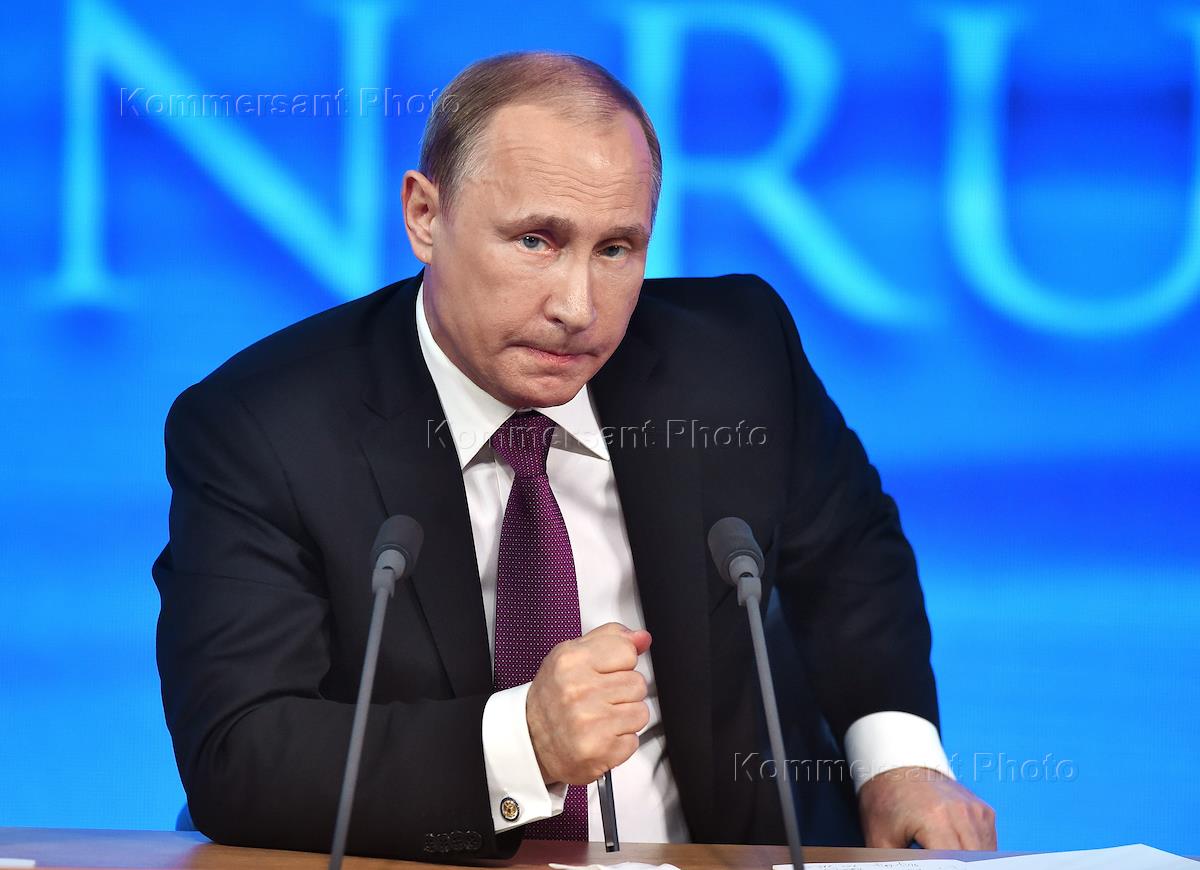 Президент России Владимир Путин на большой ежегодной пресс-конференции в здании Центра международной торговли.