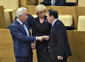 Слева направо: заместитель председателя Государственной думы (ГД) России Владимир Васильев, председатель комитета ГД по труду, социальной политике и делам ветеранов Ольга Баталина и председатель комитета ГД по бюджету и налогам Андрей Макаров во время заседания Госдумы.