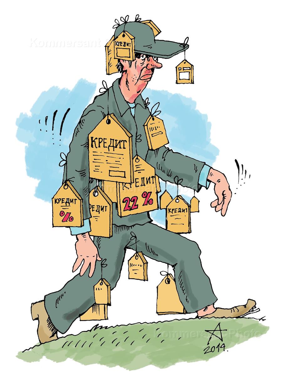 Шаржи и Карикатуры. Человек обвешанный кредитами.