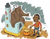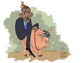 Шаржи и Карикатуры. Медведь лежит на печке, рядом Обама с барабаном в форме дрессировщика.
