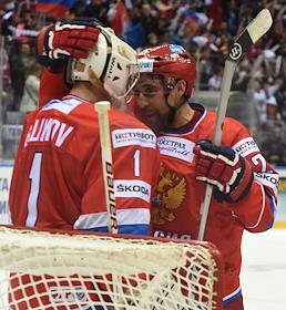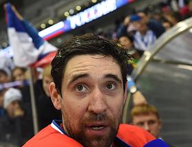 Кубок Первого канала по хоккею 2014. Матч между сборными командами России и Чехии. Игрок сборной России Данис Зарипов (слева) на церемонии награждения после окончания матча.