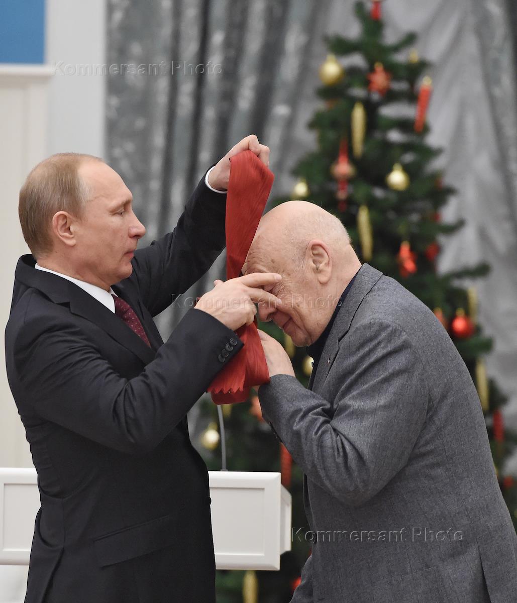 Президент России Владимир Путин (слева) во время церемонии вручения государственных наград России актеру Леониду Броневому (справа) в Кремле.
