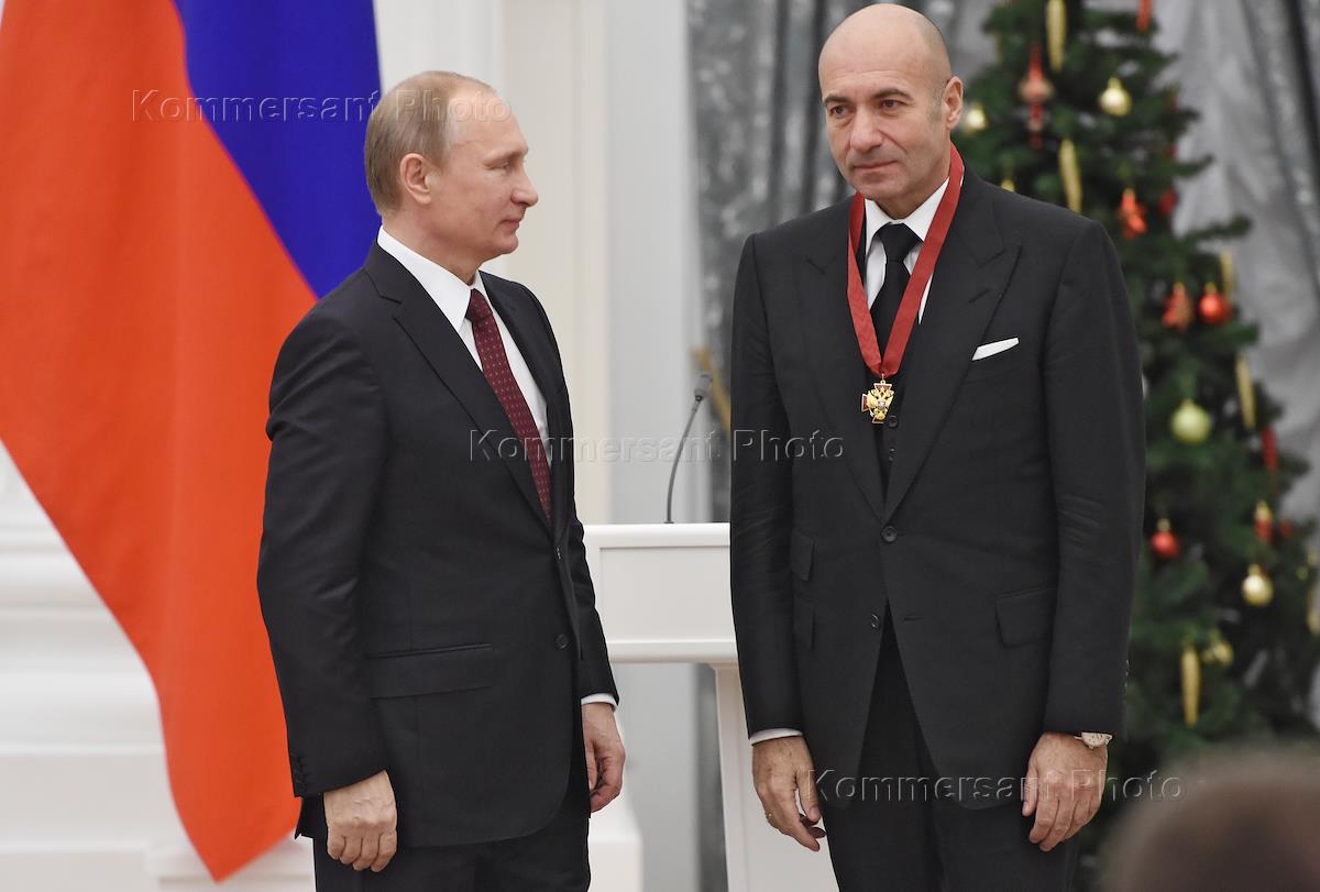 Президент России Владимир Путин (слева) во время церемонии вручения государственных наград России композитору Игорю Крутому (справа) в Кремле.