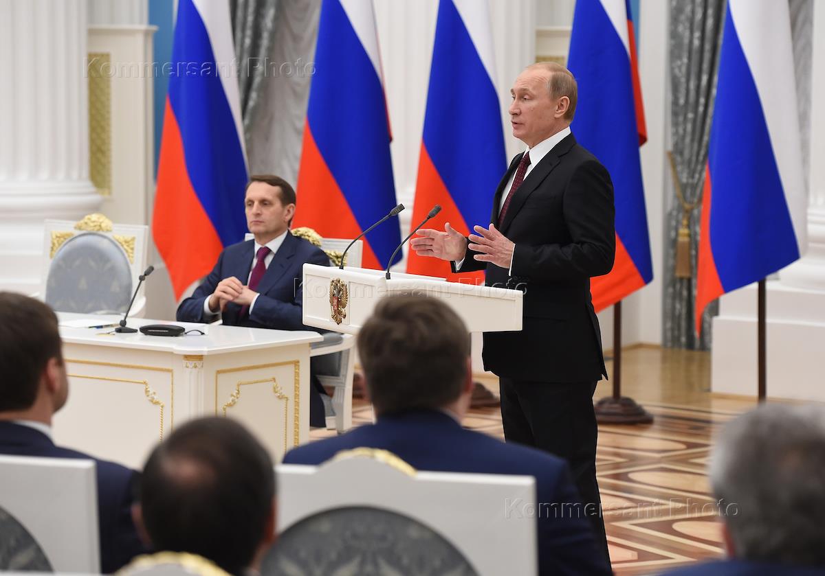 Встреча президента России Владимира Путина с руководством Федерального Собрания России. Слева направо: председатель Совета Федерации России Валентина Матвиенко, президент России Владимир Путин и председатель Государственной думы России Сергей Нарышкин во время встречи в Кремле.