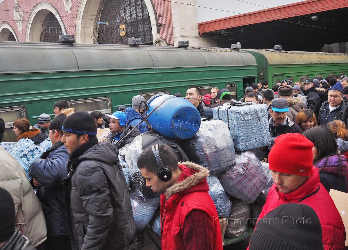 Посадка трудовых мигрантов в поезд Москва-Душанбе на Казанском вокзале.