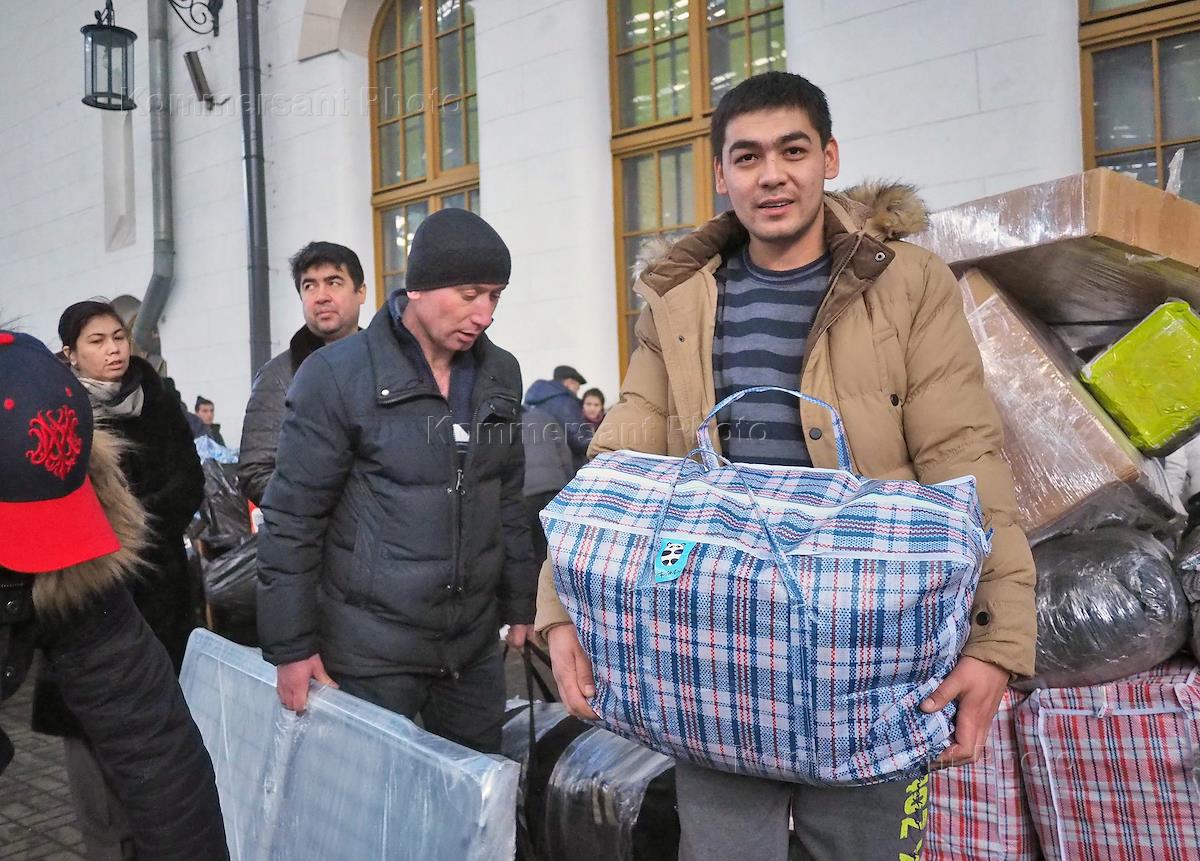 Посадка трудовых мигрантов в поезд Москва-Душанбе на Казанском вокзале.
