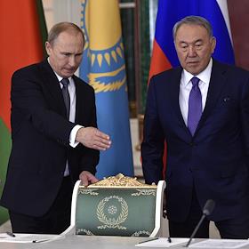 Президент России Владимир Путин (слева) и президент Казахстана Нурсултан Назарбаев (справа) на заседании сессии Совета коллективной безопасности Организации Договора о коллективной безопасности и Высшего Евразийского экономического совета. Заседания прошли в Кремле.