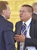 Советник президента России Сергей Глазьев (слева) и министр экономического развития России Алексей Улюкаев (справа) перед началом заседания сессии Совета коллективной безопасности Организации Договора о коллективной безопасности и Высшего Евразийского экономического совета. Заседания прошли в Кремле.