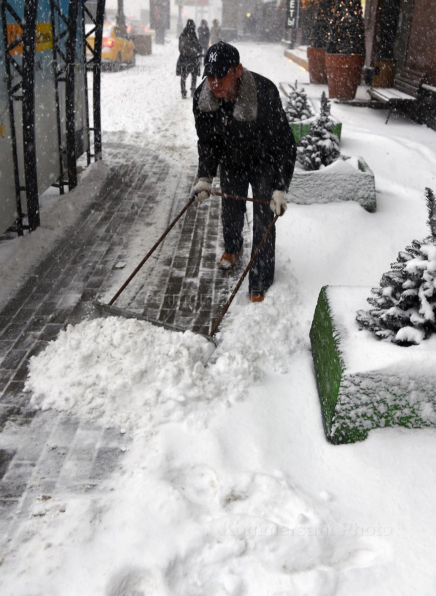 Снегопад в Москве. Мужчина убирает снег лопатой.