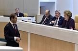 Министр финансов России Антон Силуанов (слева), председатель Совета Федерации России Валентина Матвиенко (справа) и ее заместители Ильяс Умаханов (третий справа) и Александр Торшин (второй справа) на пленарном заседании Совета Федерации России.