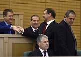 Представитель в Совете Федерации России от исполнительного органа государственной власти Чувашской Республики Константин Косачев (второй справа) на пленарном заседании Совета Федерации.