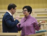 Представитель в Совете Федерации России от правительства Республики Хакасия Валентина Петренко (слева) и представитель в Совете Федерации России от исполнительного органа государственной власти Чувашской Республики Константин Косачев (в центре) на пленарном заседании Совета Федерации.
