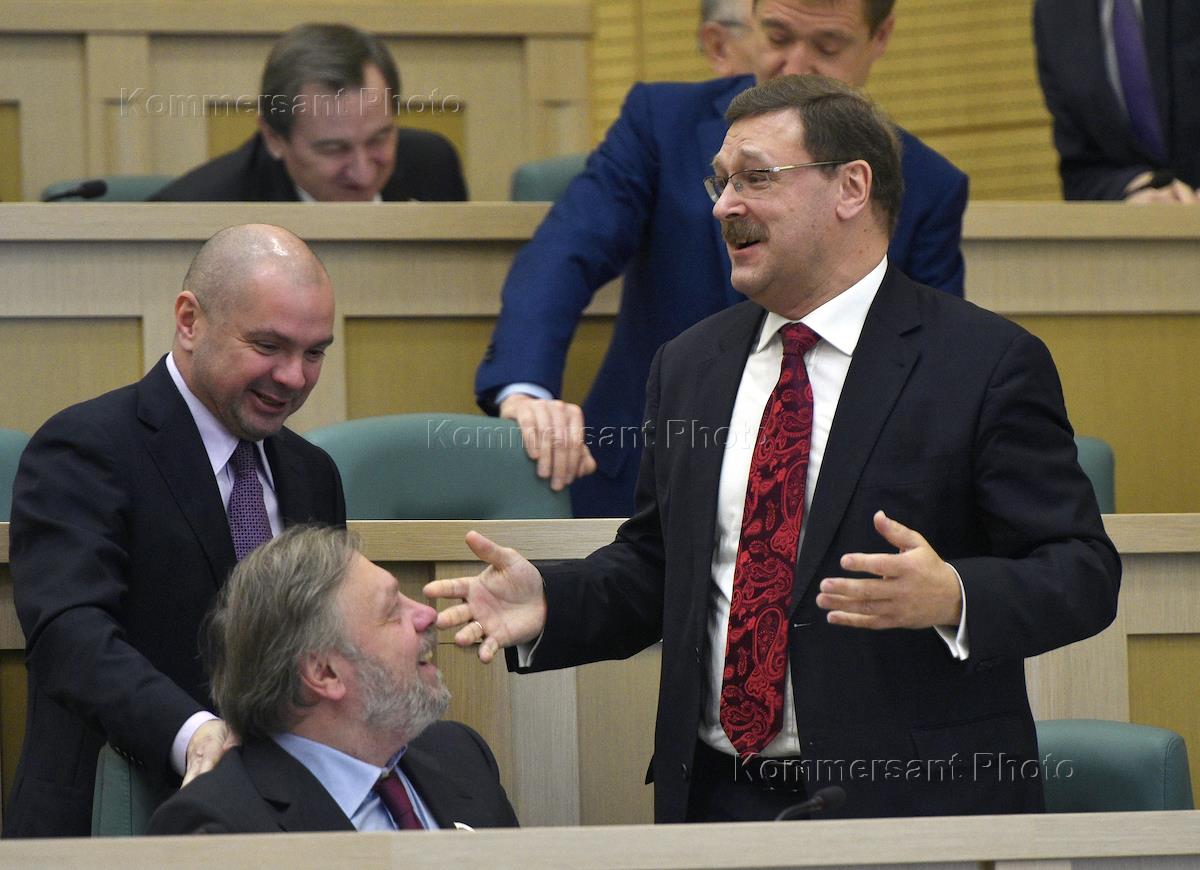 Представитель в Совете Федерации России от исполнительного органа государственной власти Чувашской Республики Константин Косачев (справа) на пленарном заседании Совета Федерации.