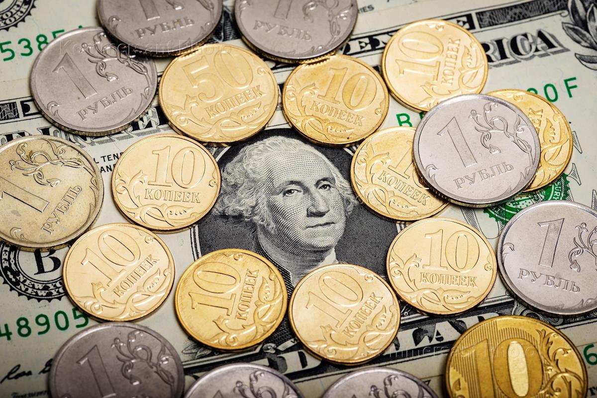 Жанровая фотография. Монеты достоинством 1 рубль, 50 копеек и 10 копеек на купюрах в 1 доллар.
