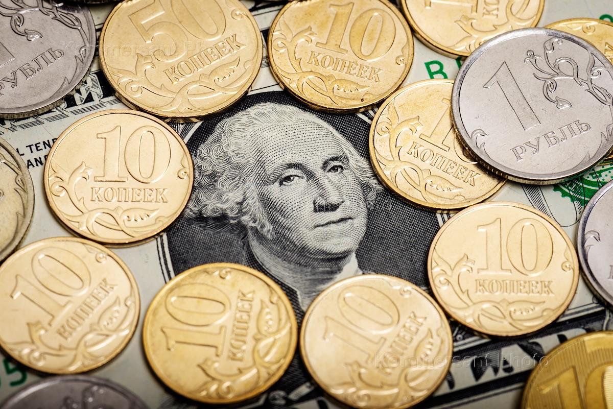The scenic photography. The rouleau of one-rouble coins and one-dollar bill.