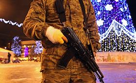 Жанровая фотография. Встреча Нового года в Донецке. Ополченец с забинтованной рукой и автоматом у новогодней елки в центре города.
