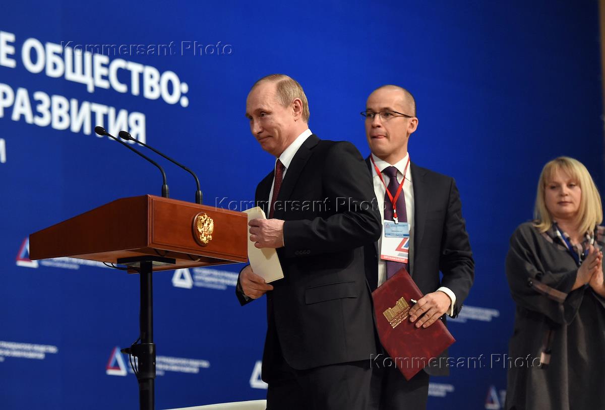 Слева направо: президент России Владимир Путин, сопредседатель Центрального штаба ОНФ Александр Бречалов, уполномоченный по правам человека в России Элла Памфилова на пленарном заседании Общероссийского форума "Государство и гражданское общество: сотрудничество во имя развития" в здании библиотеки МГУ им. М.В. Ломоносова.