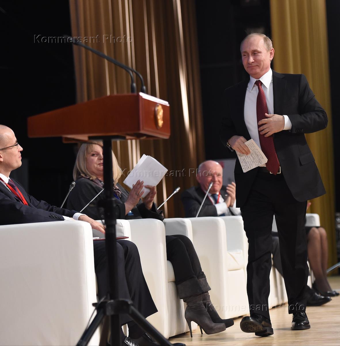 Уполномоченный по правам человека в России Элла Памфилова (слева) и президент России Владимир Путин (справа) на пленарном заседании Общероссийского форума "Государство и гражданское общество: сотрудничество во имя развития" в здании библиотеки МГУ им. М.В. Ломоносова.