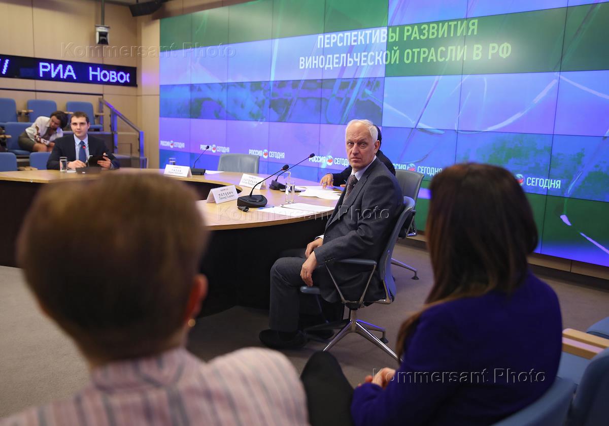 Президент Союза виноградарей и виноделов России Леонид Попович во время пресс-конференции на тему "Перспективы развития винодельческой отрасли в РФ". Пресс-конференция прошла в Международном мультимедийном пресс-центре МИА "Россия сегодня".