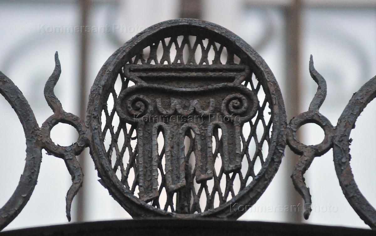 Жанровая фотография. Эмблема банка "Таврический" на кованой ограде у офиса банка.