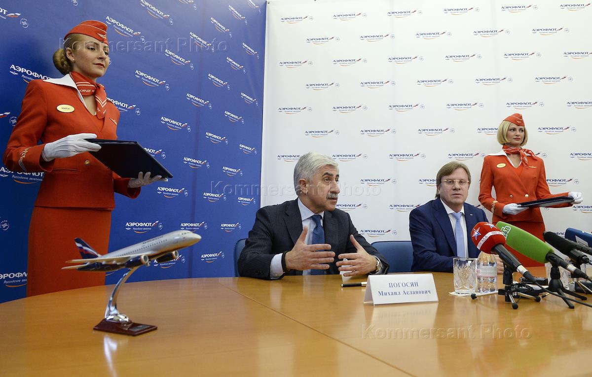 Президент Объединенной авиастроительной корпорации Михаил Погосян (справа) на церемонии подписания Соглашения о дополнительной поставке 20 самолетов Sukhoi Superjet 100 (SSJ-100). "Аэрофлот" подписал Меморандум о намерениях с Гражданскими самолетами Сухого.