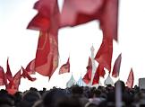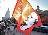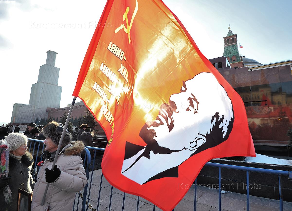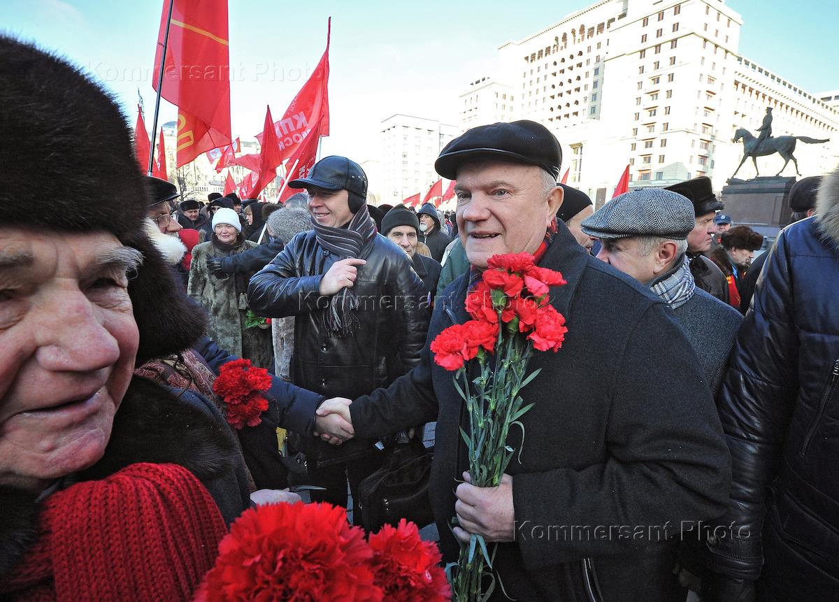 Лидер Коммунистической партии России (КПРФ), член комитета Государственной думы (ГД) России по науке и наукоемким технологиям Геннадий Зюганов (в центре) и его заместители Валерий Рашкин (второй справа) и Владимир Кашин (второй слева) на церемонии возложения цветов к Мавзолею В.И.Ленина в день 91-й годовщины со дня кончины вождя Октябрьской революции.
