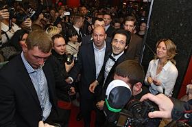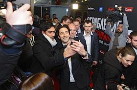 Американский актер и продюсер Эдриан Броуди (в центре) на премьере фильма "Ограбление по-американски" в кинотеатре "Октябрь".