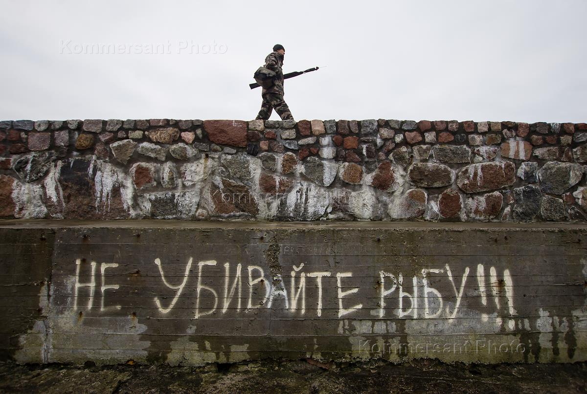 Жанровая фотография. Рыбак идет на рыбалку на побережье Балтийского пролива в городе Балтийск. На стене надпись: "Не убивайте рыбу!!!".
