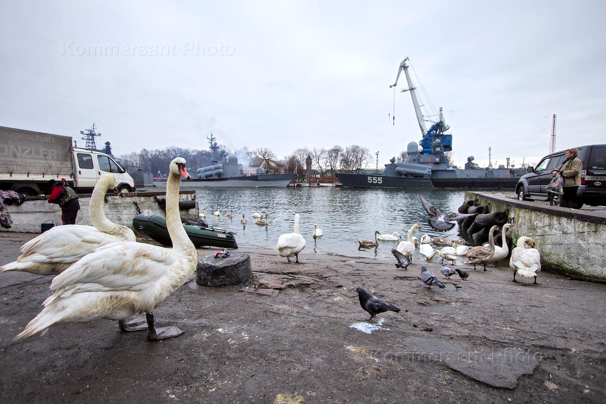 Жанровая фотография. Зимовка лебедей в военной гавани города Балтийска.